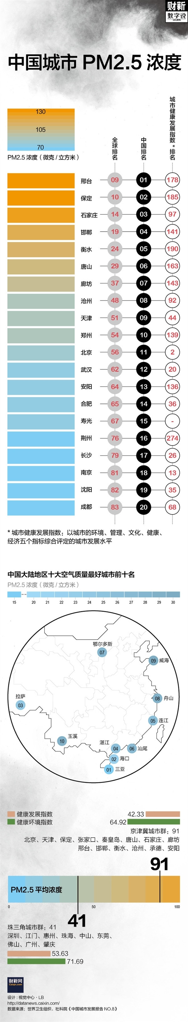 世界卫生组织(WHO)5月中旬公布最新的世界城市空气质量数据,其中显示:中国PM2.5浓度最高的前五座城市均位于河北省,分别为邢台、保定、石家庄、邯郸和衡水。其中邢台和保定进入全球细颗粒物(PM2.5)污染前十,年均浓度分别为128微克/立方米和126微克/立方米。北京以每立方米85微克的PM2.5浓度位列中国第 11、全球第56。 这份数据统计覆盖2014年全球103个国家和地区近3000个城市的颗粒物(PM10)和细颗粒物(PM2.5)污染水平。 根据WHO空气质量标准,PM2.5年平均值应小于每立方米10微克,全球80%以上的城市空气污染水平超过这一标准。中国空气污染最严重的邢台超WHO标准12.8倍。 WHO发布的最新全球城市空气质量数据库中,包括中国210个城市。中国十大空气污染最严重城市中前八个均位于河北省,河北已成PM2.5污染重灾区。 在中国,环境污染的话题一直备受关注。2015年9月,中国社科院发布《城市蓝皮书:中国城市发展报告No.8》,对2014年中国城市的健康发展水平进行评估,指出环境污染问题突出。 在2014年实施空气质量检测的161个城市中,空气质量达标的仅占9.9%。城市生态环境整体处于中偏下的水平。 从区域角度来看,东部地区特别是珠三角城市群的城市健康环境水平最高,京津冀城市群的城市健康环境水平最低。 据统计,当年京津冀地区PM2.5平均浓度达到91,珠三角城市群PM2.5浓度仅为41,与上述世界卫生组织的数据统计相符。 世界卫生组织上次更新城市空气质量数据库是在2014年,共调查了91个国家和地区约1600个城市,达标的城市的人口占整体的12%。