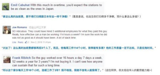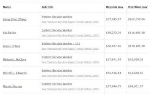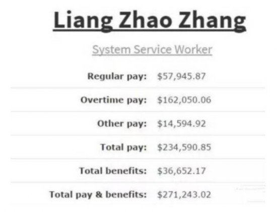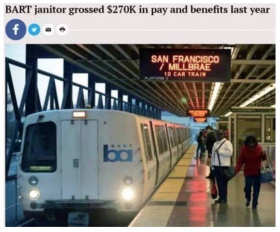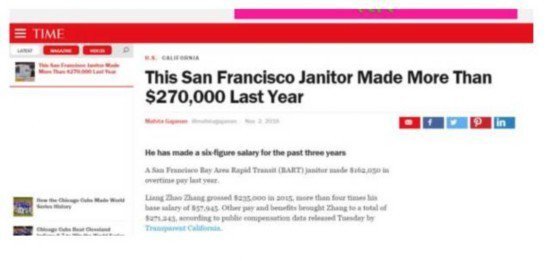 最近 , 一个名为「透明加州」 ( TransparentCalifornia ) 的非营利组织 , 公布了加州各地政府系统内职员 2015 年的收入报告。 这里面 , 有一位来自旧金山的地铁清洁工 , 亮瞎了所有人的眼 !!! 这位清洁工名叫 LiangZhaoZhang ( 张良朝 , 音译 ) , 靠打扫旧金山市区 BART ( 地铁 ) 沿线的站台 , 在 2015 年赚了 27.1243 万美元 ( 约合人民币 182.5 万元 ! ) ! 而且 , 不只是今年 , 过去三年 , 他的薪金总数就已经达到 68 万美元了 ! 据资料显示 , 张良朝的基本薪资是 5.79 万美元 ( 约合人民币 39 万元 ) , 加班费 16.2 万美元 ( 约合人民币 109 万元 ) , 再加上其他津贴 , 他 2015 年的薪酬总数超过 27 万美元。 数据一出 , 外媒一片震惊 ! 纷纷都来报道这位高薪清洁工了 : 一个清洁工为什么能拿这么高薪水 ? 据悉 , 旧金山地铁的清洁工 , 不算加班 , 平均一年薪资就有 7.77 万美元 ( 约合人民币 52.4 万 ) , 这在全美清洁工中都算高的 , 是清洁工平均薪资的三倍之多。 BART 发言人 AliciaTrost 表示 :" 我们很重视车站的清洁 , 如果清洁工作做不好 , 车站就会变得很肮脏。"," 而 BART 给的工资和员工工作质量是成正比的 , 多点薪水 , 他们会更负责。" 另外 , 地铁系统工作量大 , 人手又不太足 , 每当有其他员工休假或生病 , 或者碰上大型活动时 , 就必须安排加班。去年 BART 的加班费支出总数过 4 亿美元 , 但这也比多招员工的成本低 , 所以地铁都尽量采取加班制度。 因为经常加班 , 张良朝已经连续三年拿到了六位数的薪水。而除了张 , 去年 BART 中还有四名清洁工 ( 从姓名猜测均为华人 ) 也都拿到了巨额的加班费。 对此 ,「透明加州」研究主管 RobertFellner 表示 , 高额加班费集中在少数几名清洁工身上 , 是不是别人想加班都没机会啊 ? 不过 ,BART 发言人很快站出来辩护 :" 别的员工也可以选择加班 , 所有人的机会都是均等的。" 发言人还表示 : 张良朝的高薪是他应得的 , 去年他平均每周工作了 114 个小时 , 相当于全年无休 , 每天工作 16 个小时。" 这名员工向每一项加班工作报名 , 他几乎天天都在打扫站点的卫生。" 高薪清洁工 , 有人质疑有人点赞 ! RobertFellner 也表示 : 辛苦的清洁工能拿到 20 万美元 , 当然是好事 , 但雇员的高薪是要摊在地铁乘客身上的 , 有些乘客自己还没赚这么多呢 , 看到这个消息应该不会太高兴。 果然 , 不少网友就对此发表了酸溜溜的看法 : 对于上面的指责 , 也有很多网友站出来力挺这位高薪清洁工 : 不管在哪里 , 勤劳才能致富 ! 不说了 , 我要去美国当清洁工了 !!! ( 本文转自微信公号 : 这里是美国 )